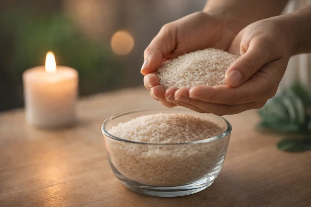 Segure o arroz entre as mãos por alguns instantes. Nesse momento, a prática não está no grão em si, mas na energia que você deposita ali. Depois, coloque esse arroz no recipiente e deixe em um lugar limpo por uma noite, como símbolo do seu compromisso com a mudança.